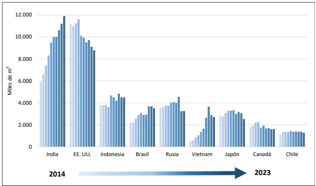 La producción y el consumo mundial de tableros contrachapados se concentran principalmente en China, con una participación del 52,6% del volumen producido. Del 48,4% restante, destaca India que dobló su producción en la última década, desplazando del segundo lugar a Estados Unidos que muestra una tendencia a la baja. Sin embargo, el consumo y la producción per cápita de India permanecen comparativamente bajos. Chile destaca como décimo productor mundial, presentando la mayor producción per cápita entre los grandes productores, y un nivel de producción estable en el periodo.